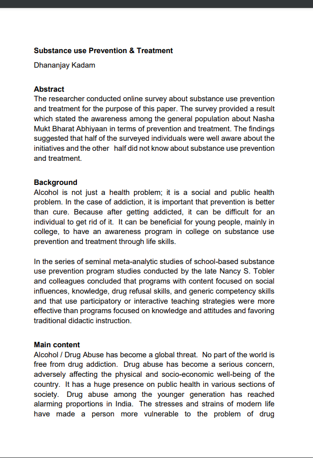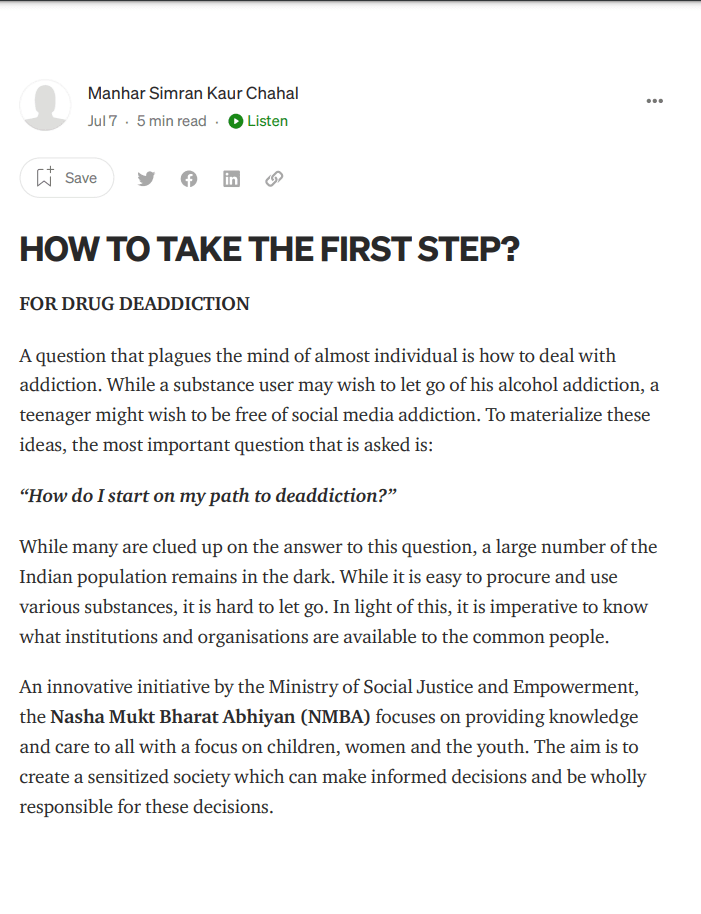Hi, I am Chetan Chauhan currently pursuing M.A. in Gender Development Studies from Indira Gandhi National Open University. Nasha Mukt Bharat Abhiyaan, under Ministry of Social Justice and Empowerment, being a student I wanted to become more aware about the ill effects of substance use and how in my capacity I can contribute to the well being of such individuals.